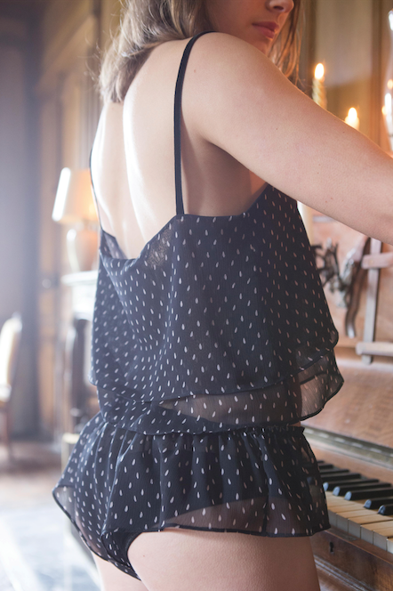 Pour sa première collection, Emmanuelle Kernen propose un voyage entre transparence de la dentelle, douceur de la soie, confort de la résille, le tout ornementé subtilement de broderies et de perlages.