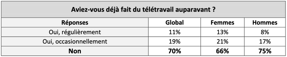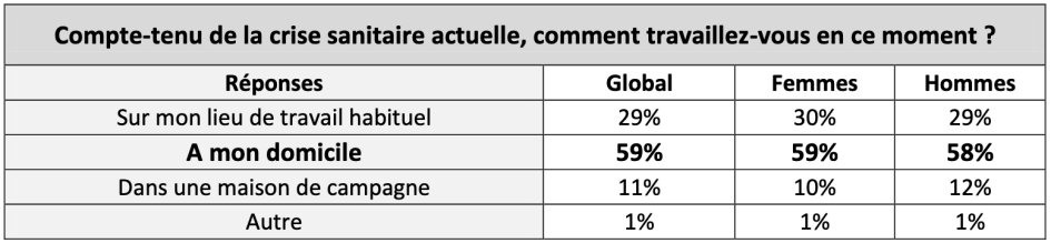 La grande majorité des Français applique avec rigueur la politique de confinement. Ainsi, moins d'un sondé sur trois (29%) dit continuer à exercer son activité professionnelle sur son lieu de travail habituel. De l'autre côté, 59% des Français déclarent travailler à leur domicile et 11% dans leur résidence secondaire. Parmi ces 70% de télétravailleurs, 89% n'ont pas l'habitude de travailler à distance et découvrent ainsi le home office.