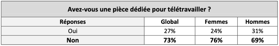 Parmi les conseils des professionnels pour s'organiser de manière efficace en télétravail, le fait de disposer d'une pièce dédiée pour s'isoler revient systématiquement. Malheureusement, cette recommandation ne s'applique qu'à une minorité de Français. En effet, plus de 73% des personnes interrogées ne disposent pas d'un espace réservé pour le home office.