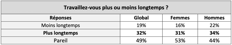 En ce qui concerne la durée du temps de travail, la moitié des Français a vu la différence depuis le début du confinement. Ainsi, 32% des sondés ont le sentiment de travailler plus longtemps que d'habitude quand 1 Français sur 5 avoue travailler moins longtemps qu'en temps normal. Pour ces derniers, la baisse d'activité générale observée ces derniers jours partout en France est certainement liée à cette baisse de régime.