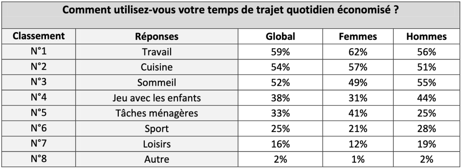 Avec l'élimination de leur trajet quotidien, 59% des Français constatent surtout travailler plus.En revanche, 54% des sondés utilisent ce temps gagné pour cuisiner et 52% pour dormir un peu plus. Parallèlement, 38% en profitent pour jouer avec leurs enfants et 33% pour effectuer les tâches ménagères. Le sport (25%) et les loisirs (16%) sont plus difficiles d'accès en cette période de confinement, même si on constate que les hommes sont globalement plus nombreux à s'accorder du temps pour eux.