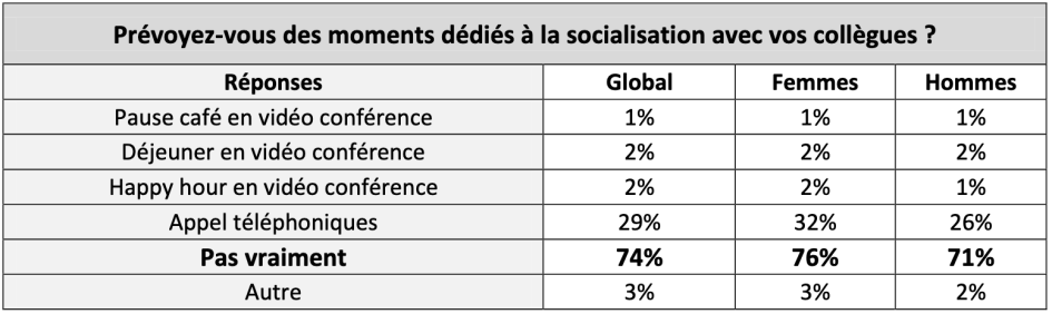 Pour conserver un lien social avec leurs collègues, 74% des sondés ne font... pas grand-chose. En effet, si 29% communiquent régulièrement par téléphone, très peu de Français utilisent les moyens technologiques à leur disposition pour partager leurs déjeuners (2%), happy hours (2%) ou leurs pauses café (1%) en vidéoconférence.