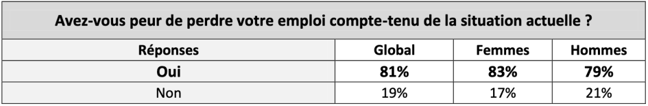En plus de la crainte d'être touchés par le coronavirus, 79% des hommes et plus de 83% des femmes avouent avoir extrêmement peur de perdre leur emploi compte-tenu de la situation actuelle.