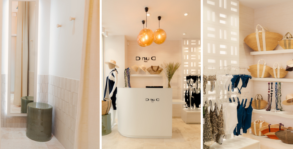 À Aix-en-Provence, DnuD transpose son univers dans un espace pensé comme une maison de vacances. L’architecture intérieure s’inspire des codes balnéaires des années 1970, avec une écriture sobre et lumineuse : sol en pierre claire, claustras ajourés, mobilier en bois… autant d’éléments qui composent un décor épuré, en résonance avec l’imaginaire méditerranéen de la marque.