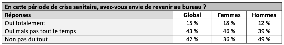 Le contexte actuel ne semble pas inciter tous les Français à retourner sur leur lieu de travail. Heureusement, plus de 58 % avouent cependant avoir envie de revenir au bureau. Seulement 15 % sont pressés d'y retourner totalement et 43 % de temps en temps uniquement. Dans le détail, les femmes sont plus disposées à revenir au travail (64 %) que les hommes (51 %).