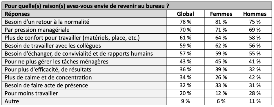 Pour les personnes qui veulent revenir au bureau, c'est le besoin d'un retour à la normalité qui prime à plus de 78 % et qui est plus présent chez 81 % des femmes (75 % chez les hommes). La pression managériale est un facteur clé pour 70 % des Français. A la troisième place du classement, le besoin de plus de confort pour travailler est important pour 61 % des personnes interrogées. Le besoin de travailler entre collègues importent 59 % des Français et celui d'échanger et d'avoir davantage de convivialité plus de 57 %.