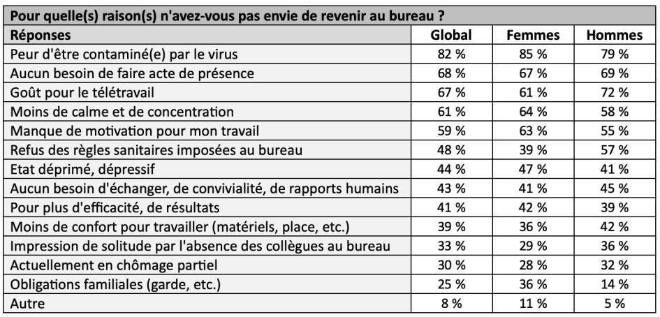 Pour les personnes qui préfèrent rester chez elles et travailler à distance, 5 facteurs arrivent en tête de ce choix. Ainsi, 82 % des Français ont peur d'être contaminés par le virus au bureau et 68 % ne ressentent pas le besoin de faire acte de présence. 67 % ont pris goût au télétravail et 61 % ont apparemment plus de calme à la maison et se concentrent mieux. Enfin, 59 % refusent catégoriquement les règles sanitaires imposés par leur hiérarchie au bureau.
