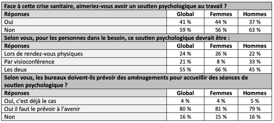 Beaucoup de Français semblent vivre extrêmement mal cette crise sanitaire. De ce fait, 44 % des femmes et 37 % des hommes avouent qu'ils aimeraient pouvoir bénéficier d'un soutien psychologique au travail. Ce soutien devrait être proposé pour 55 % des Français à la fois en rendez-vous physiques et en visioconférence. Dans tous les cas, 84 % des personnes interrogées pensent que les bureaux doivent prévoir des aménagements afin d'accueillir ces séances d'aide psychologique.