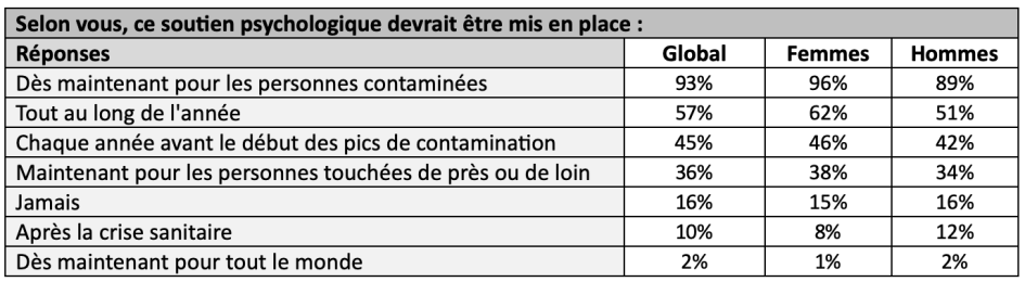 Pour 93 % des Français, ce soutien psychologique devrait être mis en place dès maintenant pour toutes les personnes contaminées par le coronavirus. 57 % estiment même que cette aide doit durer tout au long de l'année et 45 % uniquement avant le début des prochains pics de contamination qui risquent de se reproduire.