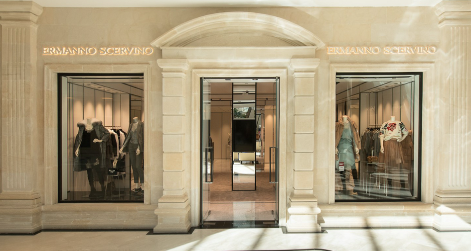 La boutique, caractérisée par deux grandes vitrines, occupe une superficie de plus de 100m2 et présente les collections de prêt-à-porter, lingerie et accessoires pour femmes de la marque. La décoration intérieure reprends les codes raffinés et élégants de la griffe italienne : le sol en marbre blanc et moquette, les murs ornés de verre fumé, effets miroir et finitions en stuc gris.