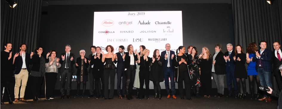 Pour clore en beauté la cérémonie, un représentant par marque membre du jury ainsi que les sponsors de l’événement ont été appelé à monter sur le podium. Rappelons que cette édition 2019 a bénéficié de la présence de 18 marques nationales et étrangères de lingerie de jour et de nuit, loungewear et bain, exclusivement issues du circuit sélectif.  Parmi elles, nous avons pu compter les grands noms de la corseterie française tels qu’Aubade, Chantelle, Lise Charmel, Maison Lejaby, Simone Pérèle, Lou, mais aussi le spécialiste en lingerie de nuit Le Chat. Du côté de l’international, le jury de cette année a accueilli la Belge PrimaDonna, les Allemandes Triumph, Anita et Maryan Mehlhorn pour le balnéaire, les Italiennes Oscalito et Paladini, l’Italo-américaine Cosabella, l’Autrichienne Hanro, ainsi que la Japonaise Wacoal. Cette année, deux marques supplémentaires rentrent dans le jury : Antigel, du groupe Lise Charmel, et la Roumaine Jolidon. Le concours a également compté sur le soutien du fabricant de fibres japonais Asahi Kasei avec ses marques de pointe Roica et Bemberg, du dentelier italien Iluna, et, pour la première fois, du célèbre fabricant allemand de coques pour soutien-gorge Muehlmeier.