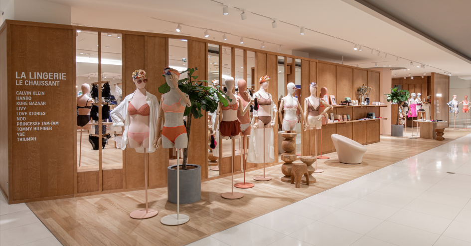 Sur plus de 900 mètres carrés, ce nouvel espace illustre la volonté de créer des parcours faisant sens pour les clients du célèbre grand magasin, avec des zones de respiration et d’échanges ainsi qu’une offre repensée célébrant une nouvelle définition de la féminité. Au sein de cet espace, on retrouve les univers lingerie, bas et collants, ainsi que bain, sans oublier un labo créateur. Le tout est rythmé par un pop-up ainsi qu’une série d’espaces dédiés et à la forte personnalité : Invité de la saison, Leçon de mode, Kure Bazaar et Le Grand Geste.
