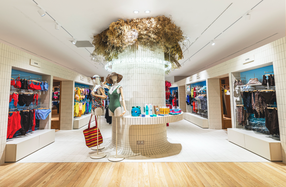 Pour mieux se démarquer de l’espace lingerie, l’univers bain se pare de murs carrelés rappelant les piscines vintage et cabines d’essayage qui n’ont rien à envier aux plus beaux spas parisiens. Grâce à une offre renouvelée en fonction des saisons, remplir sa valise pour partir en voyage devient un jeu d’enfant. À retrouver également dans cet espace bain, une offre renouvelée avec des marques premium côtoyant les classiques du marché parmi lesquelles : Lemlem, Lisa Marie Fernandez, Off-White, Laura Urbinati, Isabel Marant.