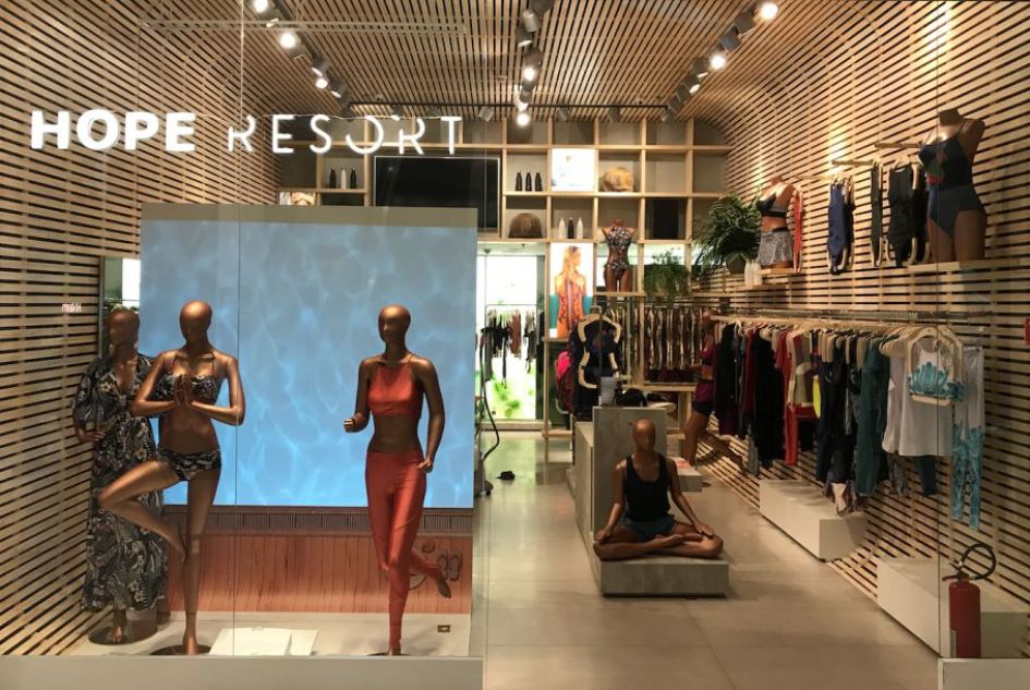 ❤ On aime l’audace et le mélange des matériaux dans cet espace de 60m2 conçu par Bob Neri du célèbre cabinet d’architectes Be.Bo. Réalisés dans une continuité de lattes en pin, les murs et le plafond contrastent avec le sol en céramique dans un ton béton. Le mobilier d’exposition est lui aussi en bois et céramique et accueille des modèles mariant confort et mode, pensés pour la plage et l’activité physique. Composé de trois cabines fermées par de grandes portes miroir, la zone essayage est séparée de l’espace de vente grâce à une grande structure d’exposition, tandis qu’au fond de grands panneaux rétro-éclairés simulent des fenêtres translucides derrières lesquelles se cache un jardin d’hiver avec de superbes plantes qui ont subi un processus de conservation pour en maintenir l’intégrité. Dans cette boutique, pas de caisse, les achats s’effectuent directement auprès du personnel de vente ! Rappelons que, spécialisée dans la mode lingerie, balnéaire et fitness, l’entreprise Hope est née en 1966 sous l’égide de Nissim Hara, son actuel Président. Le groupe compte aujourd’hui trois marques – Hope Lingerie, Hope Resort et Bonjour, l’une des marques lingerie les plus populaires du Brésil – et est présent dans plus de 5.000 revendeurs multimarques dans tous le pays ; il exporte aussi ses collections dans plus de 18 pays sur les 5 continents. Depuis 2006, une stratégie retail a été mise en place permettant à Hope de vendre à ce jour ses collections dans 180 franchises et 9 boutiques en propre. Enfin, l’ouverture de 5 boutiques à l’enseigne Hope Resort – 1 en propre et 4 franchises – est prévue d’ici la fin de l’année.