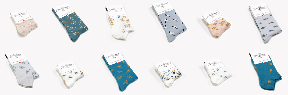 Pour la femme, les socquettes hautes et les modèles invisibles s’affichent avec une envolée de motifs végétaux et floraux, nénuphars, oies et autres oiseaux. Pour ces messieurs, les chaussettes mi-hautes ou invisibles font la part belle aux motifs homards, poissons, requins ou, encore, cigognes.