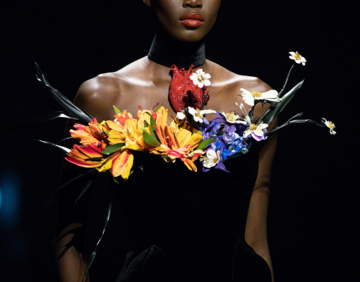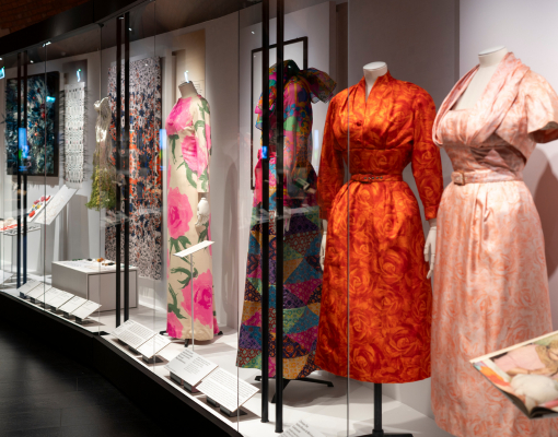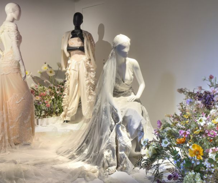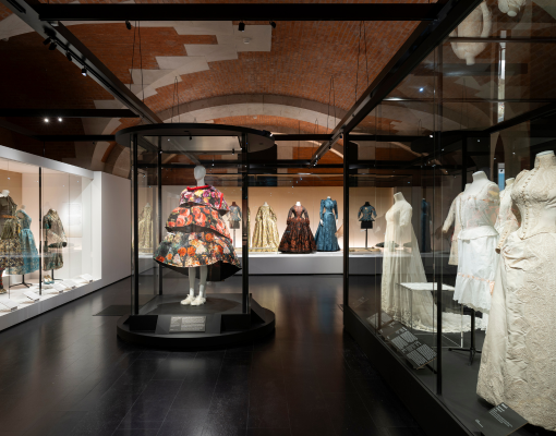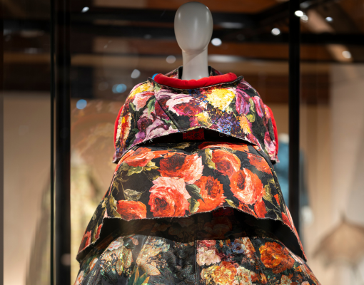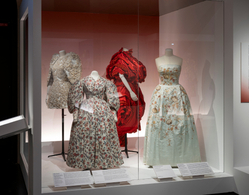 La première exposition met à l’honneur les techniques d’ornementation, tissage, impression, broderie, dentelle ou encore fleurs artificielles, à travers un motif central, la fleur. Présente dans le textile et la mode depuis le XVIIIᵉ siècle, elle permet d’explorer les jeux de matières, de couleurs et de volumes qui caractérisent ces savoir-faire.