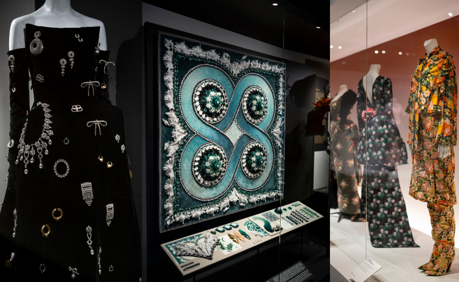 Plus de 350 œuvres sont réunies, vêtements, accessoires, photographies, échantillons ou outils, mêlant créations de maisons de haute couture et pièces de jeunes designers. Du textile broché d’un gilet du XVIIIᵉ siècle à l’impression laser d’un ensemble Balenciaga, le parcours illustre la diversité des techniques tout en révélant les gestes et métiers qui se cachent derrière chaque création.