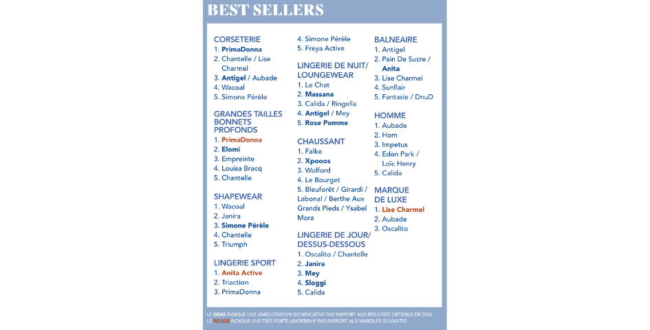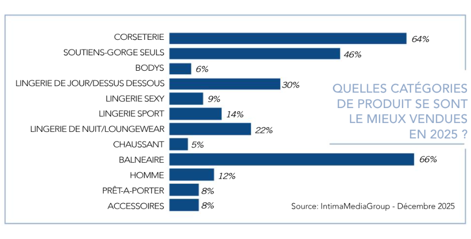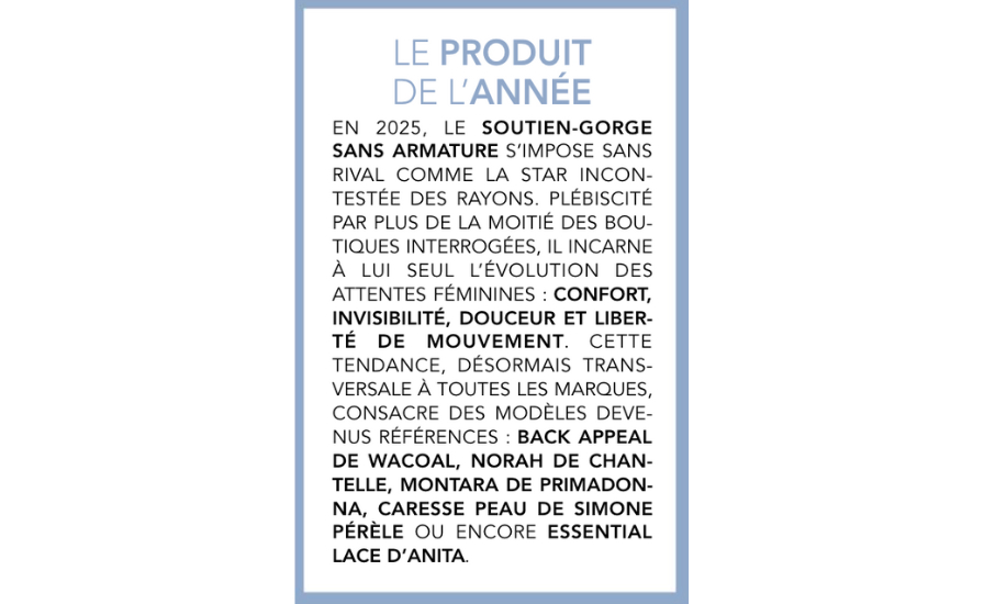 Bien que la CORSETERIE demeure le pilier de l’offre des boutiques de lingerie, son attractivité s’effrite encore (citée par 87 % des interviewés en 2023, elle est tombée à 64 % en 2025) en faveur d’autres catégories de produits plus en phase avec les besoins des consommatrices actuelles, en quête de souplesse et de confort. Les SOUTIENS-GORGE vendus seuls confirment cette dynamique, symboles d’un mix & match libéré des ensembles traditionnels, tandis que la LINGERIE DE JOUR et de SPORT poursuivent leur montée, portées par leur polyvalence et leur adéquation avec des tenues plus décontractées. La ventilation des achats apparaît plus équilibrée cette année, sauf pour la LINGERIE DE NUIT traditionnelle qui poursuit sa descente, accompagnée par la LINGERIE SEXY. Le BALNÉAIRE signe une excellente performance figurant parmi les meilleures ventes de l’année de 66 % de notre panel, un vrai bond en avant par rapport à la saison précédente, rendu possible par une saison estivale particulièrement favorable. Toujours marginaux chez les boutiques françaises, les segments HOMME, ACCESSOIRES et le PRÊT-À-PORTER.