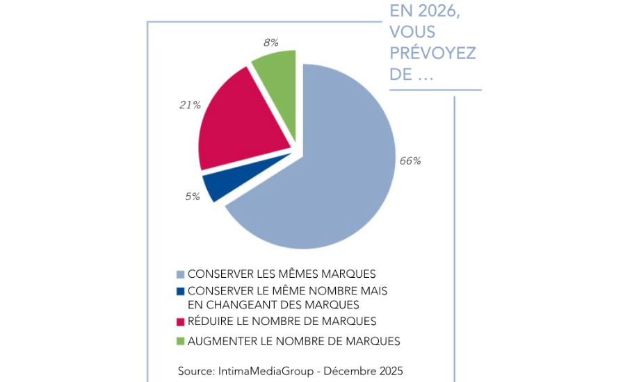 La prudence domine les projections pour l’année à venir et la grande majorité des boutiques - 66 % - comptent conserver leurs marques actuelles, privilégiant la fidélité et la continuité. Dans un contexte encore incertain, beaucoup préfèrent consolider plutôt que bouleverser leur offre. Si 21 % envisagent de réduire leur portefeuille, 8 % souhaitent au contraire l’élargir, timidement mais sûrement, et 5 % prévoient de remplacer quelques marques pour mieux répondre aux attentes de leur clientèle.