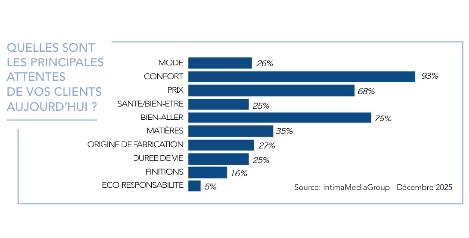 En 2025, le CONFORT (cité par 93 % des boutiques, avec plus 5 points sur 2024) gagne encore du terrain et se confirme comme la priorité absolue des consommatrices ; il n’est plus un simple critère, mais un véritable prérequis, indissociable du bien-être au quotidien et associé au concept de BIEN-ALLER (75 %), reflet d’un besoin de produits adaptés à chaque morphologie et d’un accompagnement personnalisé en cabine. Le PRIX se stabilise en troisième position (68 %) dans un contexte de pouvoir d’achat encore tendu. Derrière ces priorités, d’autres critères émergent : la qualité des MATIERES (35 %) la SANTE ET LE BIEN-ETRE, ou encore le soin apporté aux FINITIONS qui gagne des points. À l’inverse, la MODE perd 5 points, L’ORIGINE des produits chute de 9 points et l’ECO-RESPONSABILITE recule légèrement, preuve que si le sujet reste présent dans les esprits, il pèse encore peu dans la décision d’achat immédiate, tout comme – hélas ! - la DUREE DE VIE des produits.