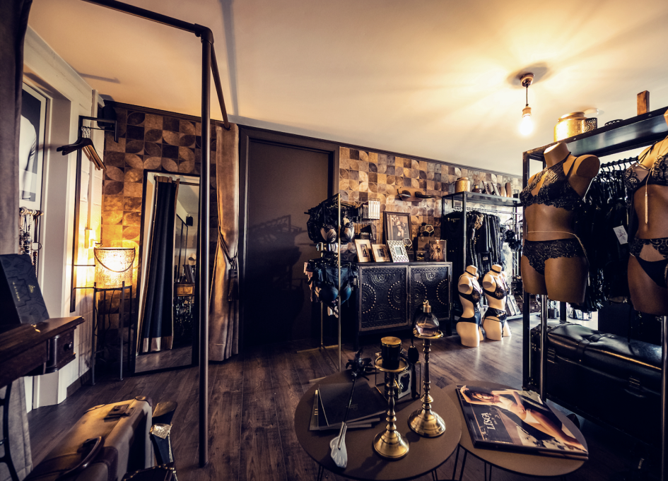 C’est après avoir créé un site de vente en ligne, que Cindy a décidé de lancer son enseigne - au concept très privé - loin des regards indiscrets, dans une nature verdoyante à Stembert, 20 minutes de Lièges.❤ On aime l’idée d’une certaine exclusivité, le choix original d’une boutique égarée au creux d’un bois. Accessible seulement pour certaines privilégiées, il faut en effet prendre rendez-vous pour pouvoir bénéficier en toute discrétion d’une séance shopping en couple ou entre amies. Le décor, largement inspiré de l’ambiance des années 20-30, évoque un moment hors du temps, qui n’est pas sans rappeler l’univers de Gatsby, à mi-chemin entre opulence et décadence, conférant ainsi à la boutique un air de dressing coquin confortable et accueillant. Le parquet en bois  sombre s’harmonise avec les teintes cuivrées des mannequins, des portants, et des bibelots disposés ça et là, mais également avec les cages à oiseaux en fer forgé qui abritent des accessoires coquins, perchés et gardés sous clés comme des objets d’un paradis presque interdit. Design industriel et bobo chic se croisent dans cette décoration élégante, tendance et un brin érotique, où toutes les envies peuvent être assouvies grâce à une large gamme de produits choisis avec le plus grand soin pour envelopper les femmes d’un voile sexy au quotidien, et ce, quel que soit le budget. Cravache, cuir, banquette capitonnée, malles vintages, cadres photos d’articles de sellerie, parures osées… Tous les codes du porno-chic sont réunis, faisant ainsi discrètement planer une ambiance 50 nuances de Grey. Graphiste et webdesigner aguerrie, Cindy gère elle-même le marketing (réseaux sociaux, photoshoots, référencement..) de sa boutique, et, très attentive à ses clients et à leurs besoins,  elle propose de nombreux services tels que la livraison à domicile.