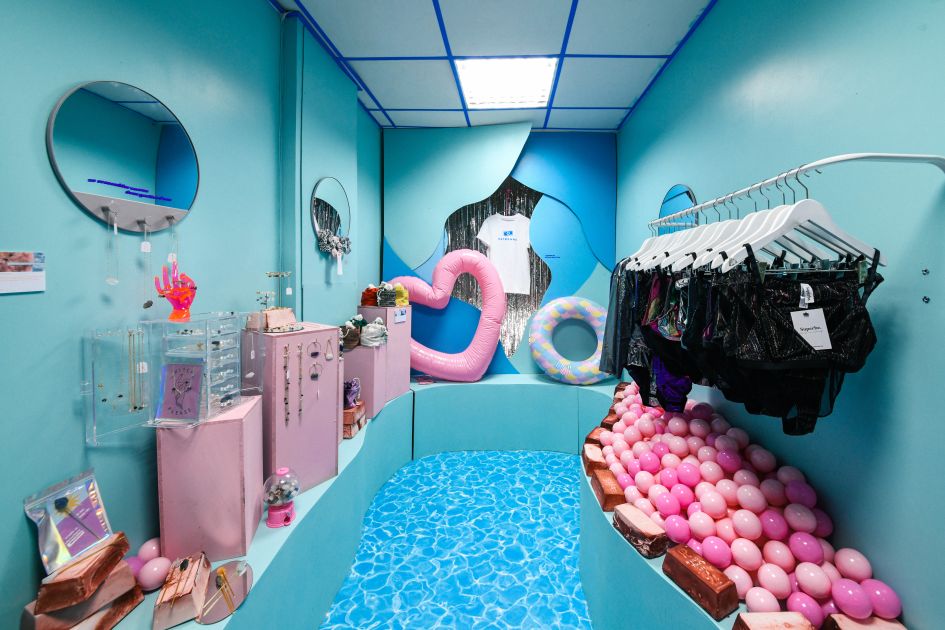 La boutique est basée sur une expérience utilisateur. Chez Plouf nous faisons le parallèle entre se lancer dans le grand bain et prendre des décisions pour voir grossir son activité. C’est donc naturellement que la boutique ressemble à une piscine ludique, revisitée aux couleurs chatoyantes et aux motifs géométriques. Les visiteurs achètent un billet au guichet, passent par le vestiaire et plongent dans l’univers des marques éthique exposantes. Pour vivre l’expérience, je vous invite à venir nous voir !