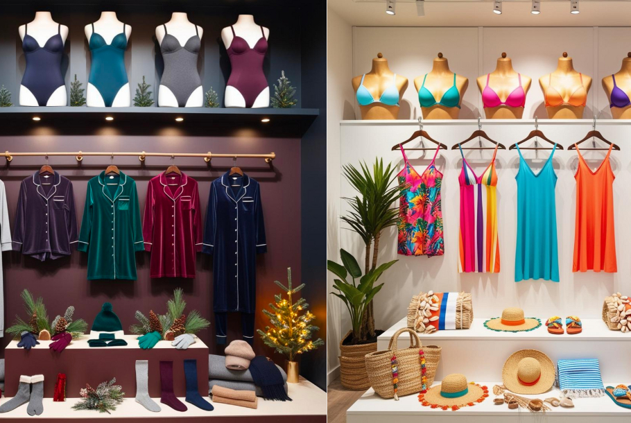 Agencer une boutique de lingerie, c’est comme gérer deux magasins en un : celui de l’hiver, rythmé par les dessous cocooning, les pyjamas, les peignoirs et autres tenues d’intérieur, et celui de l’été, habillé de maillots de bain, tuniques, caftans et accessoires estivaux dans un esprit de vacances...