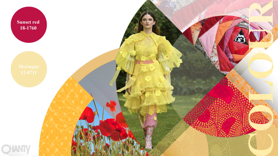 TWO WORLDS WERE BROUGHT TOGETHER IN THE PROCESS: EXTRAVAGANT AND EXPRESSIVE FLORAL PATTERNS MEET GEOMETRIC SHAPES AND PATCHWORK ELEMENTS. THESE LIVELY DESIGNS SPARKLE WITH VITALITY AND DIRECTLY PUT YOU IN A GOOD MOOD. THE FRIENDLY 'MERINGUE' IS REMINISCENT OF A SWEET DREAM AND IN COMBINATION WITH 'SUNSET RED' IT CREATES A MAGICAL ATMOSPHERE.