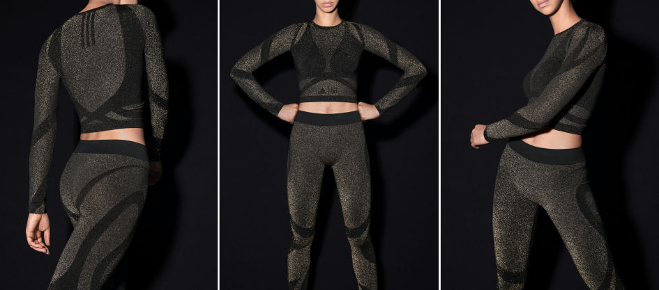 STUDIO MOTION (capsule 1) comprend un ensemble épuré composé d’un haut à manches longues et d’un leggings. Ici, les techniques sophistiquées de tricotage de la maille associées aux fils métallisés permettent d’obtenir un look ultra brillant, le tout avec des lignes fluides qui soulignent les courbes du corps… pour une allure originale aussi bien pour pratiquer une activité sportive que lors d’une escapade en ville.