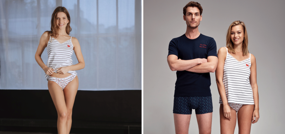 Pour elles, Armor Lux a pensé à un caraco aux airs marin, avec une encolure en dentelle, des bretelles réglables et une broderie « Mon Amour Mon Armor » sur la poitrine, sans oublier une culotte rayée, coupe confort, avec de petits cœurs rouges imprimés.