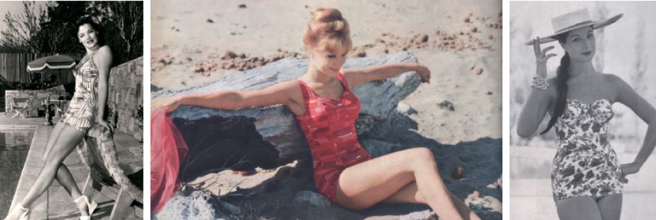 Le maillot de bain à jupette est le grand succès des années 50 ! Destiné à habiller un peu plus la baigneuse, il a l’avantage de pouvoir être porté au bar de la piscine ou dans les jardins de l’hôtel. Le maillot n’est plus forcément « de bain », il peut être de plage ou de cocktail, lors de ce que les américains appellent les « Pool Parties ». Un style balnéaire flamboyant s’impose dans cette décennie, Les imprimés sont à l’honneur ainsi que les lamés et les maillots sont agrémentés de boutonnage, faux laçage, ceintures et larges poches. La jupette peut être droite, entrouverte, portefeuille ou coupée façon short.