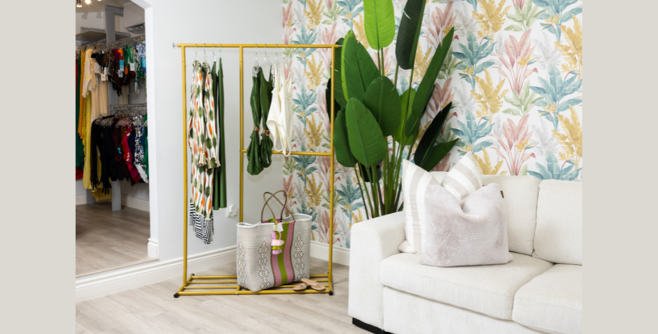On aime la déco toute en fraîcheur, les murs immaculés, un papier peint tropical qui invite au voyage, une grande plante verte qui insuffle de la vie, et ces portants dorés, juste ce qu’il faut de chic.