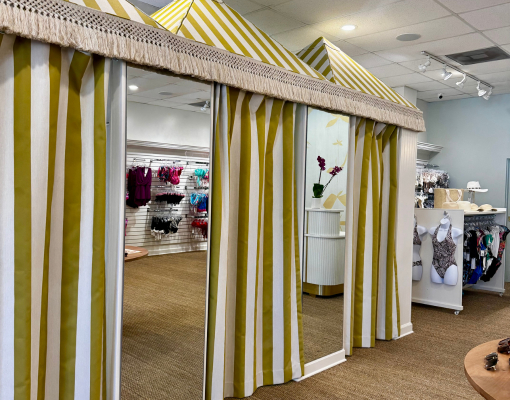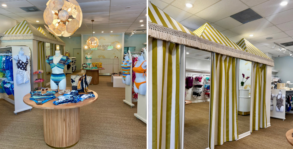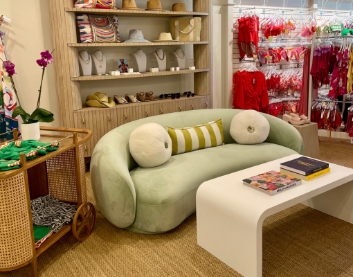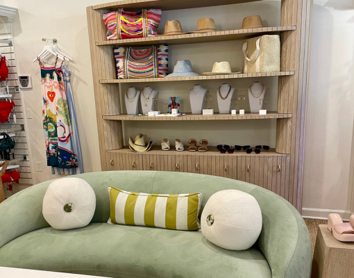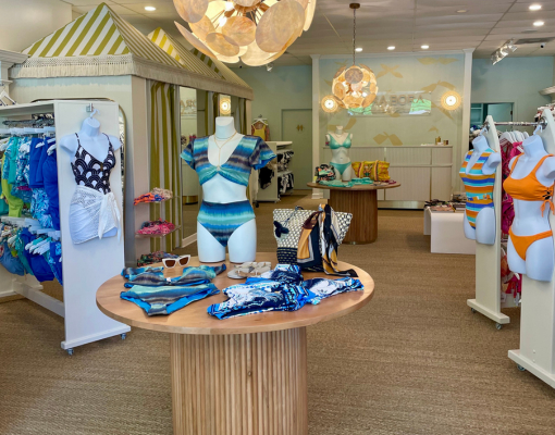 L’intérieur évoque le charme intemporel des clubs de plage européens, avec ses teintes vert d’eau, ses luminaires inspirés des coquillages et ses cabines d’essayage façon cabana, baignées de lumière, qui rappellent les vacances au soleil. Du coussin fantaisie en forme de ballon de plage au chariot à cocktail en osier vintage, chaque détail décoratif évoque une échappée chic et dépaysante. Côté collections, la boutique propose une mode balnéaire à la fois haut de gamme et inclusive, avec un éventail de coupes et de tailles : des imprimés audacieux et coupes flatteuses de Maaji ou Beach Riot, aux silhouettes plus classiques de Seafolly ou Jantzen.