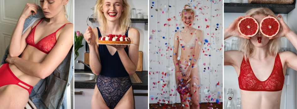 A la fois sexy et élégante, imaginée pour un grand nombre de femmes avec des tailles proposées du XS au XL, la première collection se compose de six modèles : un string invisible, une culotte toute en dentelle, une culotte taille haute en microfibre et dentelle, un triangle sexy, une brassière confort et un body à porter aussi bien sous les vêtements qu'avec un jeans. Tous les modèles sont disponibles dans une palette de coloris qui, pour marquer le coup de cette première collection, fait un clin d’œil au Made in France : bleu night, blanc rosé et un rouge hot.