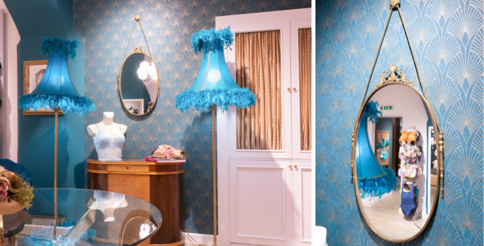 On aime le motif Déco en éventail du papier peint, le miroir années 30 et les abat-jour bordés de plumes... un clin d’œil à Gatsby le Magnifique !