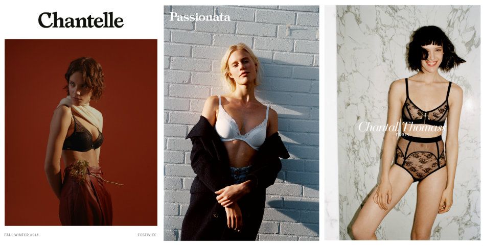 Sous ce chapeau groupe s’intègrent nos différentes marques de manière complémentaire et harmonieuse : Chantelle, forte de son héritage innovant, se tourne vers l’avenir en travaillant la dimension plus design de son ADN, Passionata s’impose comme une marque résolument tournée vers le plaisir et la liberté, Chantal Thomass continue de creuser son sillon de marque irrévérencieuse à l’état d’esprit indépendant, et Femilet se présente comme la marque scandinave par excellence. Les repositionnements image témoignent de ces évolutions. Ils se sont opérés sur trois principaux niveaux : l’identité visuelle (photo, vidéo, design), l’identité graphique (logo, couleurs, typographies, mises en page) et le « style » de communication (le « tone of voice » ou comment la marque s’exprime). Sur Chantelle, Passionata et Femilet, nous avons engagé une refonte complète sur les différents niveaux dès le PE18. Sur Chantal Thomass, l’évolution est plus progressive.