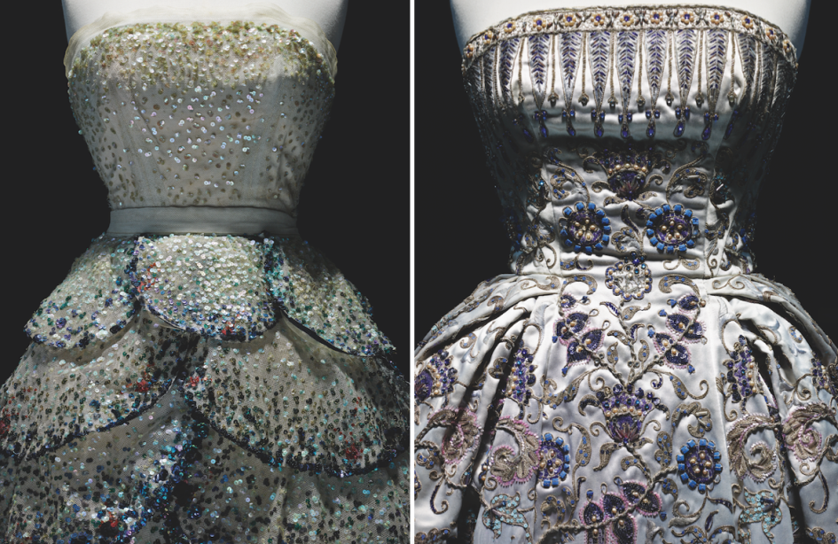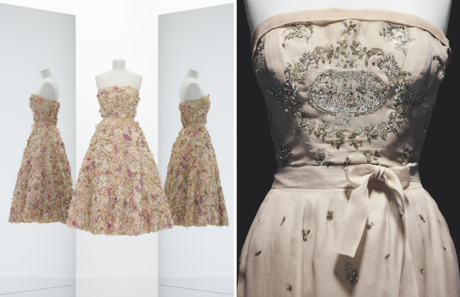 Photo de droite: Christian Dior, robe Trianon, collection haute couture printemps-été 1952, ligne Sinueuse, robe du soir en organdi de Jean Page, broderie de lamé, paillettes métalliques et perles argent, Palais Galliera, musée de la Mode de la ville de Paris, don Francine Halphen-Clore, 1984. © Photo Les Arts Décoratifs, Paris / Nicholas Alan Cope
