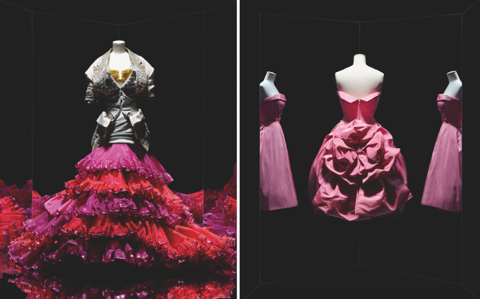 Photo de droite: Christian Dior, robe Opéra Bouffe, haute couture automne-hiver 1956, ligne Aimant. Robe du soir en faille de soie d’Abraham. Paris, Dior Héritage. © Photo Les Arts Décoratifs / Nicholas Alan Cope