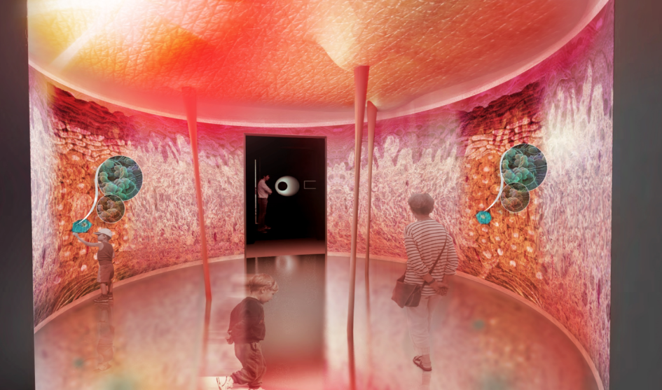 Le visiteur est invité à pénétrer dans l’exposition par un tunnel dont les murs reproduisent les images acquises par imagerie multi photons, une récente technique de microcopie laser puissante qui révèle la morphologie des différentes cellules dans leurs proportions réelles : la couche cornée, l’épiderme, le derme et l’hypoderme…