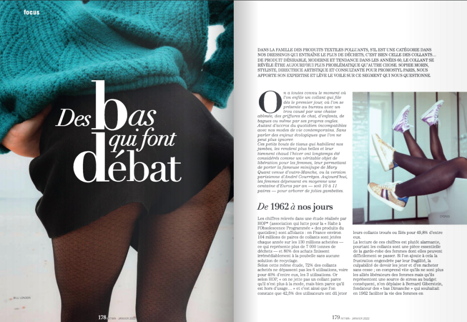 Les chiffres relevés dans une étude réalisée par HOP* (association qui lutte pour la « Halte à l’Obsolescence Programmée » des produits du quotidien) sont affolants : en France environ 104 millions de paires de collants sont jetées chaque année sur les 130 millions achetées —ce qui représente plus de 7 000 tonnes de déchets — et 80% des achats finissent irrémédiablement à la poubelle sans aucune solution de recyclage.