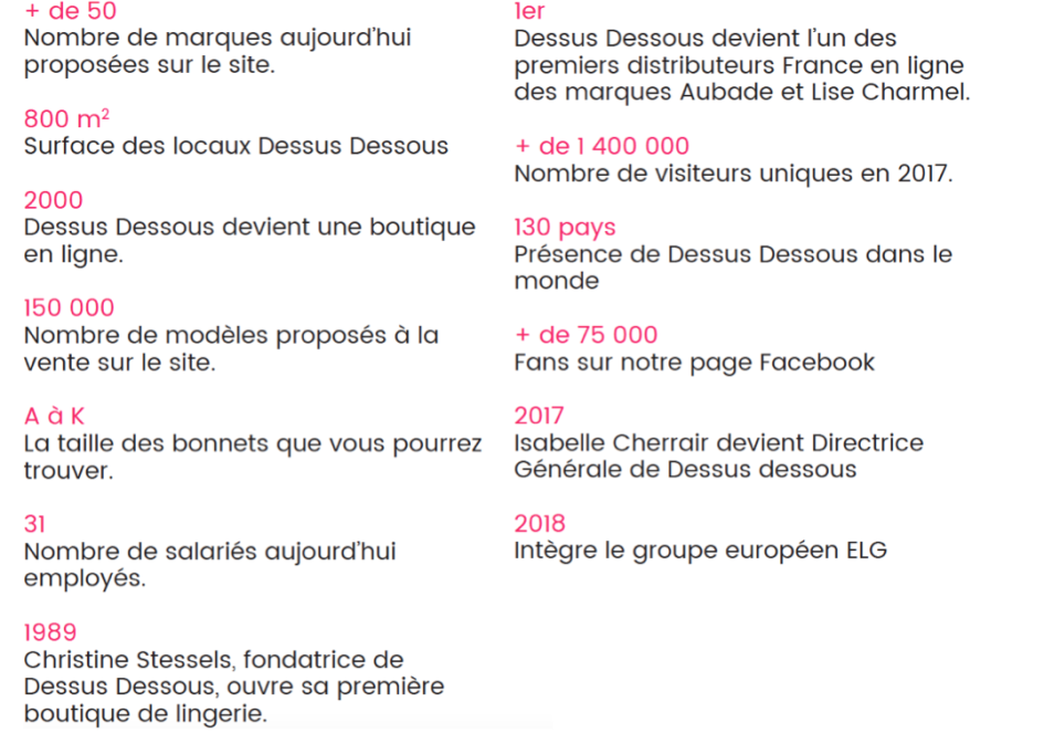 Juin 2018 marque le début d’une nouvelle aventure : l’entreprise du sud de la France, qui a débuté avec une petite boutique de centre-ville, est reprise par un acteur phare du secteur textile et lingerie, European Lingerie Group, lui conférant ainsi une dimension internationale.Aujourd’hui, Dessus Dessous peut se vanter de proposer un site en version française et anglaise, le choix entre 6 devises (euro, dollar américain, dollar australien, yen, franc suisse et livre sterling) et une livraison de plus de 50 marques dans plus de 130 pays.