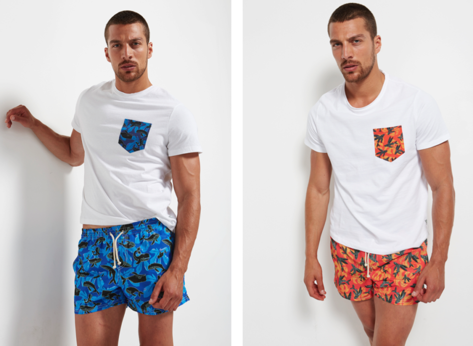 Avec des imprimés et coloris interprétés dans un style pop art, couplés à des accents empruntés au monde du surf, l’artiste a puisé son inspiration de son enfance passée au bord de la Méditerranée : les motifs dessinés à la main font la part belle aux tortues, requins et poissons volants, tandis que la palette s’inspire des mers et océans de notre planète : rouge pour la Mer Rouge, bleu pour l’Océan Pacifique, vert pour la Mer des Caraïbes et bleu clair pour l’Océan Indien. Réalisés dans un polyester recyclé à partir de bouteilles plastiques, les 4 shorts de bain aux motifs vibrants s’associent à 4 T-shirts avec poche imprimée coordonnée.