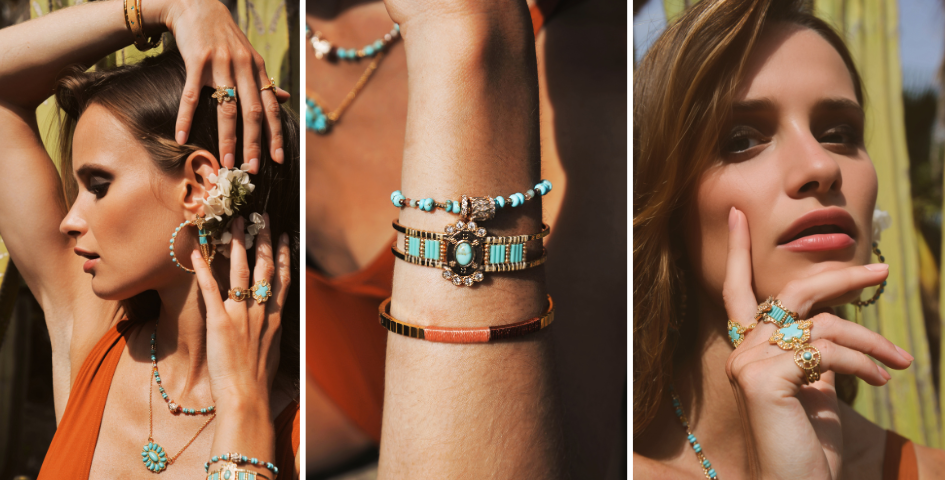 Des bijoux dorés, sublimés par des turquoises aux teintes divinement chatoyantes. Chaque pièce, véritable chef-d'œuvre, incarne un style bohème chic évoquant l'élégance sauvage de l'inspiration Navajo, capturée au cœur du désert d'Arizona.