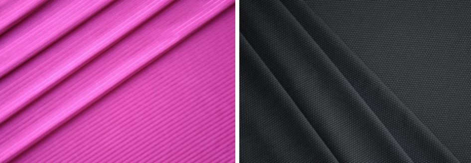 Avec sa structure élégante et fonctionnelle à côtes plates brillantes, Renew Folk (à gauche) est pensé pour la réalisation de modèles bain jeunes et pétillants et est parfait aussi bien pour une utilisation en solo, pour un look 100% Renew Folk, que en association à d’autres tissus « plats » tels que Renew Shine.