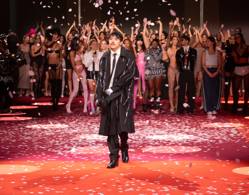 Puis “Pure” a exploré le minimalisme à travers des jeux de transparences et des matières innovantes, redéfinissant la seconde peau dans un esprit à la fois confortable et sculptural. Enfin, “Fatale” a clôturé le show dans une atmosphère couture et magnétique, entre noir absolu et éclats d’or, avec la participation du couturier Nicolas Fafiotte.