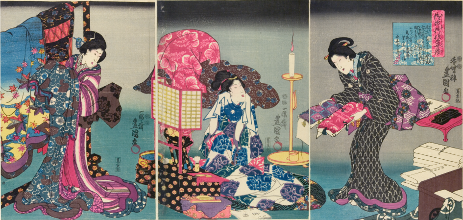 Motifs brocart mode du Palais Impérial, estampe, réalisée par Utag Utagawa Kunisada, 1847-1852, Japon. Museum no. Circ.636 to Circ. 638– 1962. © Victoria and Albert Museum, London
