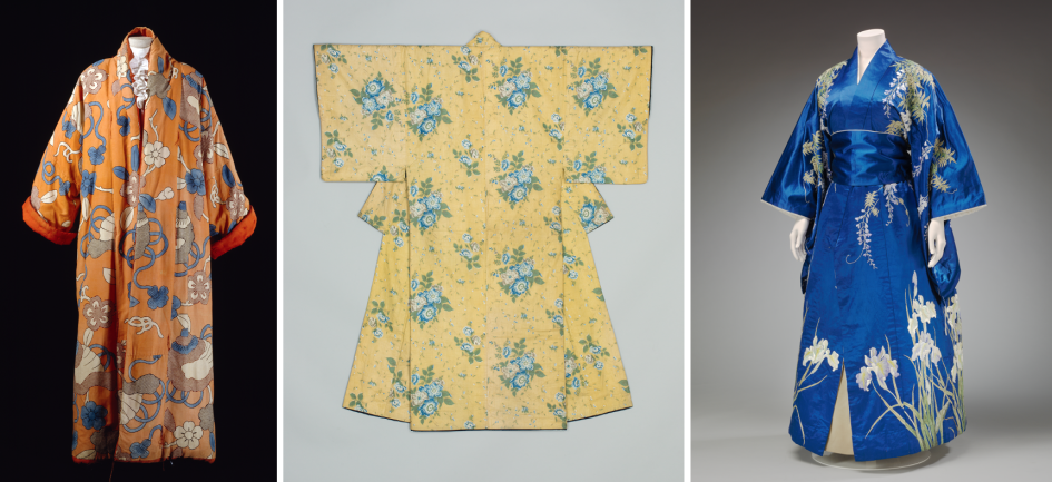 Le kimono fût exporté pour la première fois en Europe au milieu du 17ème siècle, engendrant un impact immédiat sur les styles vestimentaires de l’époque. Des tissus étrangers sont également importés au Japon pour être incorporés dans la création des kimonos. Seules quelques pièces ont survécu au temps et témoignent, encore aujourd’hui, de cette époque d’échange culturel, dont notamment des modèles faits au Japon pour les Néerlandais ainsi que des kimonos enrichis de brocarts français ou de chintz indien.