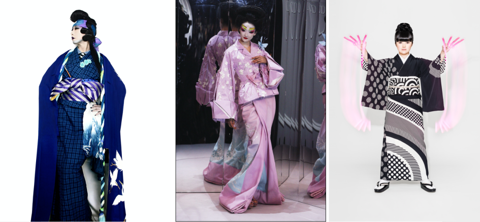 Le Japon lui-même assiste actuellement à un regain d’intérêt pour le kimono : le designer Jōtarō Saitō donne vie à des kimonos couture qu’il fait défiler sur les podiums, l’artiste textile Hiroko Takahashi s’attache quant à lui à combler le fossé entre l’art et la mode, tandis qu’une ribambelle de looks plus décontractés sont créés par de petits ateliers indépendants comme Rumi Rock et Modern Antenna.