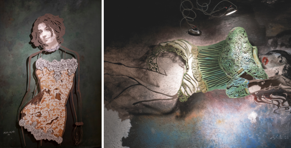 La série Silhouette di ferro révèle des figures dont le fer, parfois peint, parfois laissé nu, change avec le temps et s’oxyde comme une peau qui vieillit. Dans Camminante, une silhouette citadine coiffée d’un chapeau et chaussée de sneakers semble entrer dans le tableau. Dans Allucinazione, un pull vert paraît entièrement métallique, mais dissimule un fragment de tronc d’olivier. Les éclairages mobiles multiplient les effets visuels.