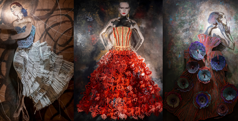 L’hommage à Roberto Capucci (2024) prend la forme d’un double panneau en fer peint, d’où émergent des roses sculptées. La rigidité du métal y devient drapée. Avec Abito rosso (2022), inspiré d’une robe de Gianni Calignano portée par la top-modèle Agnese Zogla, muse de Giorgio Armani, la soie devient bois et le coton devient fer. La jupe, construite par la répétition d’un module unique, évoque une onde en mouvement. L’hommage à Gianfranco Ferré (2025) clôt le triptyque : un corsage peint à l’acrylique, enrichi de sable et de poudre de café, dialogue avec une jupe faite de lamelles métalliques qui structurent le mouvement.